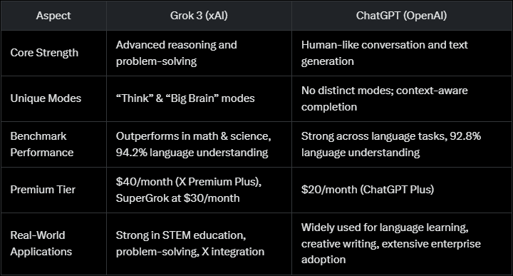 This comparison reveals Grok 3’s strengths in technical domains, while ChatGPT excels in creative and conversational contexts.